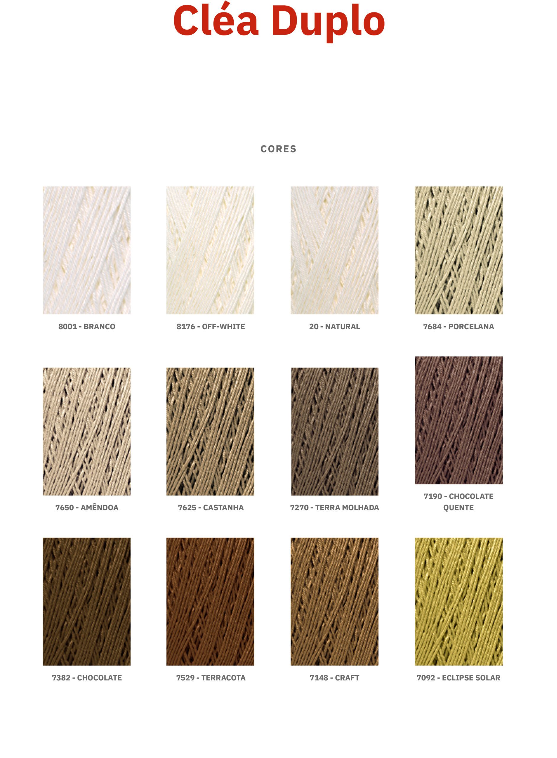 Cléa Duplo é o fio 100% algodão mercerizado com torção especial da linha Cléa. Ele tem o dobro de espessura e não abre ao tecer. Por isso, dá um acabamento perfeito à peça. Suas criações ficarão com uma estrutura única, mais firme e resistente, mas ainda assim de trama delicada e toque macio. A mercerização confere um brilho único ao fio. Sua cartela de cores é diferenciada. Tem 69 cores vibrantes. É ideal para moda em crochê e tricô.