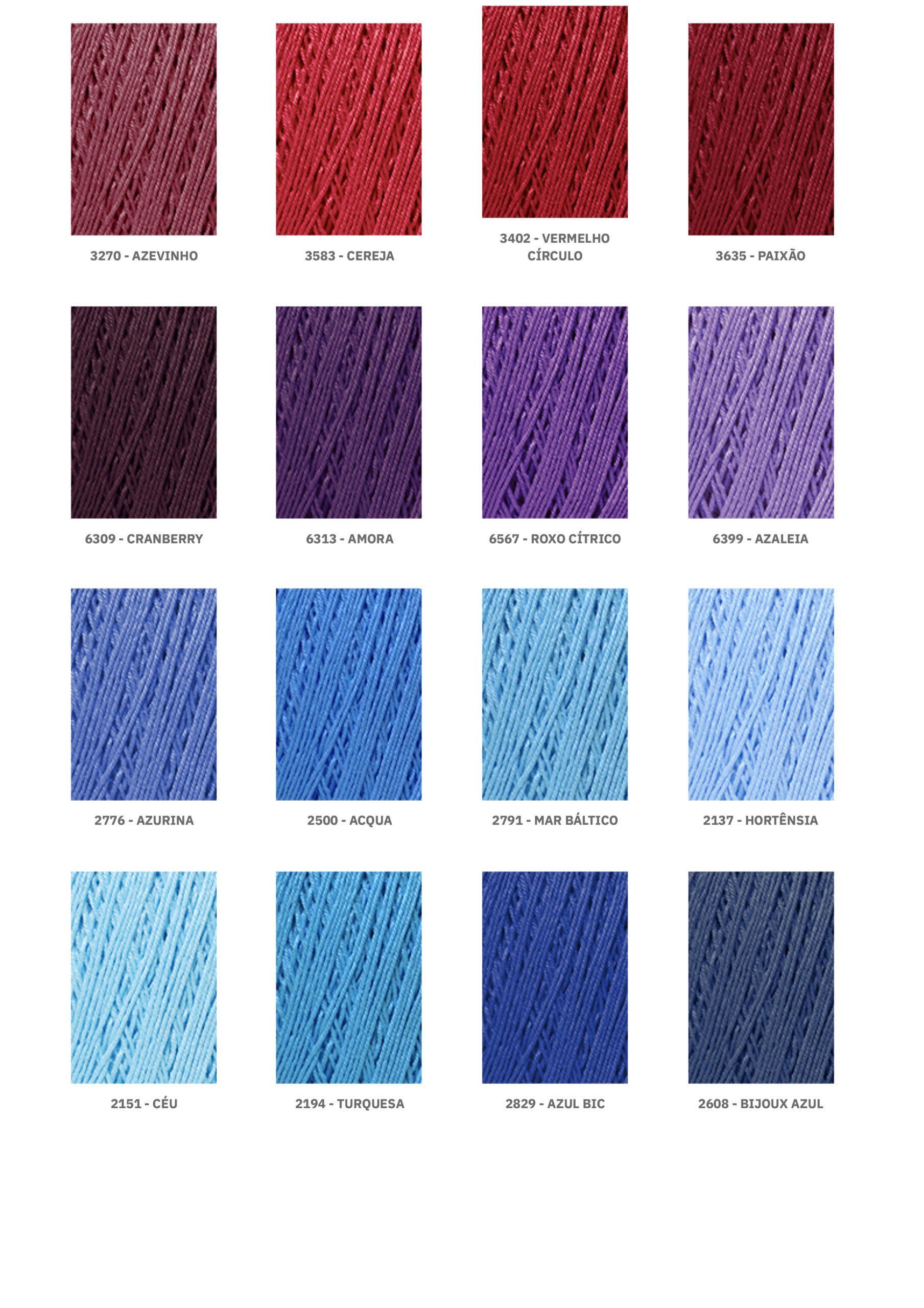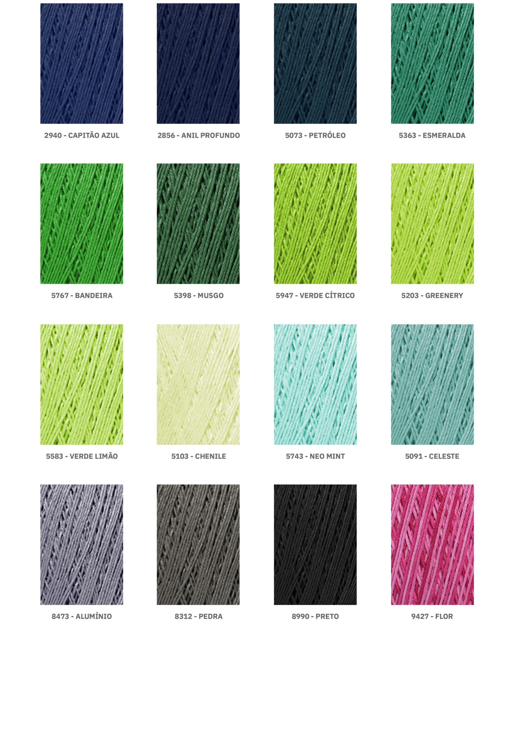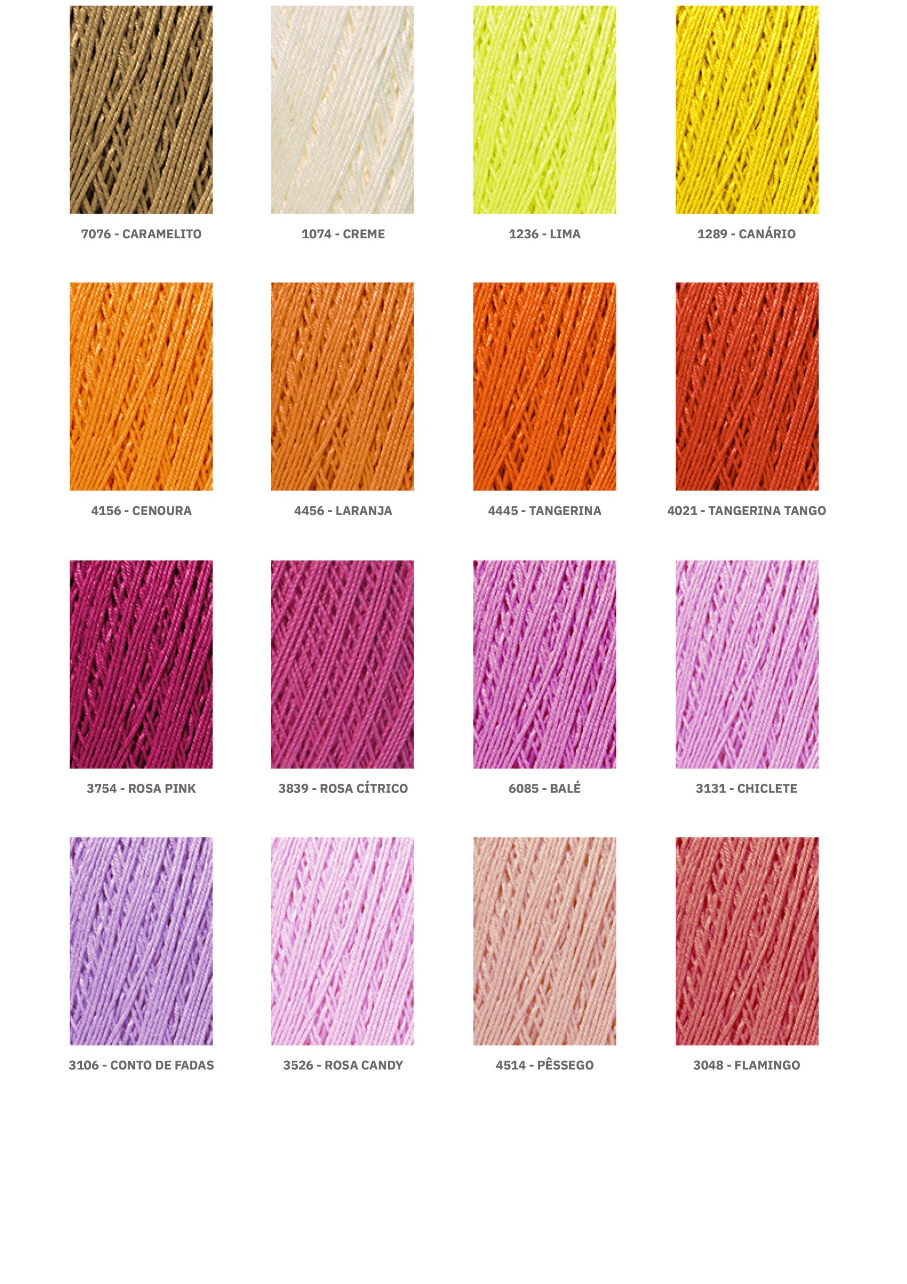 | COR | 8001 Branco, 8176 Off-white, 20 Natural, 7684 Porcelana, 7650 Amêndoa, 7625 Castanha, 7270 Terra Molhada, 7190 Chocolate Quente, 7382 Chocolate, 7529 Terracota, 7148 Craft, 7076 Eclipse Solar, 7092 Caramelito, 1074 Creme, 1236 Lima, 1289 Canário, 4156 Cenoura, 4456 Laranja, 4445 Tangerina, 4021 Tangerina Tango, 3754 Rosa-Pink, 3839 Rosa-Cítrico, 6085 Balé, 3131 Chiclete, 3106 Conto de Fadas, 3526 Rosa-Candy, 4514 Pêssego, 3048 Flamingo, 3270 Azevinho, 3583 Cereja, 3402 Vermelho-circulo, 3635 Paixão, 6309 Craberry, 6313 Amora, 6567 Roxo-Cítrico, 6399 Azaléia, 2776 Azurina, 2500 Acqua, 2791 Mar Báltico, 2137 Hortência, 2151 Céu, 2194 Turquesa, 2829 Azul-Bic, 2608 Bijoux Azul, 2940 Capitão Azul, 2856 Anil-Profundo, 5073 Petróleo, 5363 Esmeralda, 5767 Bandeira, 5398 Musgo, 5947 Verde-Cítrico, 5203 Greenery, 5583 Verde-Limão, 5103 Chenile, 5743 Neo Mint, 5091 Celeste, 8473 Alumínio, 8312 Pedra, 8990 Preto, 9427# Flor, 9153# Cababré, 9392# Folha, 9172# Amuleto, 9337 Marshmallow, 9921 Frapê de Uva, 9976# Parque, 9278 Lhama, 9784 Filé, 8736 Indigo |